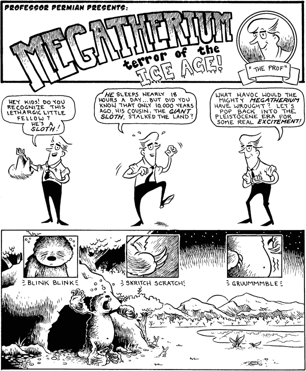 Since it’s now officially Free Comic Book Day, you can cruise on over to www.wideawakepress.com and download Piltdown, the dinosaur/caveman-themed comic book for free as a PDF. If’n you’re one ah’ them youngsters, what with your “manga” and whatnot, and you like to read the funnybooks right on your computer, I’ve made a quick CBZ version of the book you can download here.Besides me, other folks contributing are J. Chris Campbell, Patrick Dean, Dustin Harbin, Josh Latta, Joe Lambert, Pat Lewis, Brad McGinty, Andy Runton and more. I’ll post my giant sloth story here the first page of my giant sloth story here–for the rest, though, you’ll need to download the complete book.