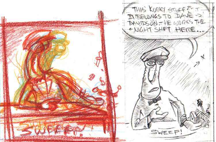 When I’ve got something I’m reasonably happy with, I can scan it, resize it to fit on the bristolboard page that the final artwork will be on, and use a lightbox to trace a rough outline of it onto the board. In this case, though, I wasn’t entirely happy with the colored pencil rough, so I just winged it a bit and copied it onto the board by sight and then refined the image a bit in the pencilling process.