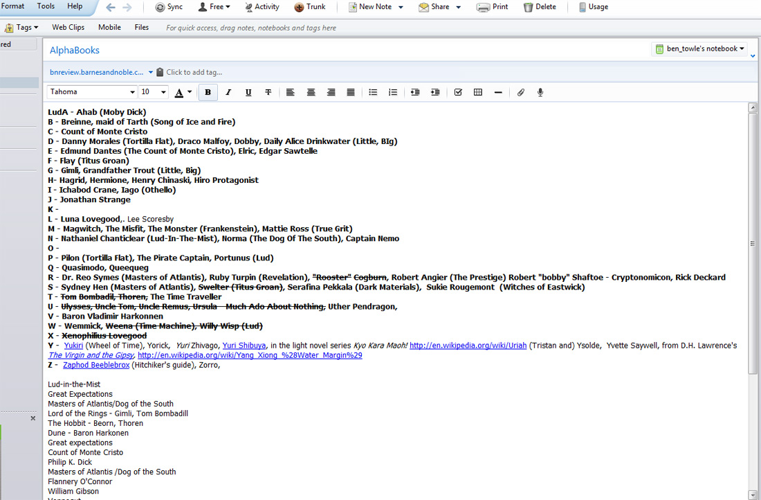 - I should have done more advance planning. I had to break my self-imposed rule of “only characters from books I’ve read” for my “X” and “Y” entries, but if I’d planned things better, I wouldn’t have needed to. I should have had my A-Z list decided on before I started–or at least had the more difficult letters populated. Here’s how my list looked at the end of the project: