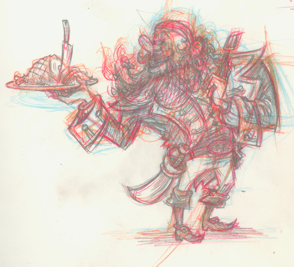 While I’m pretty happy with the final image here, it took a lot of doing to get there, as this pencil sketch image demonstrates. It took me four “layers” (blue, orange, red, graphite pencil) to get an image I was happy with: