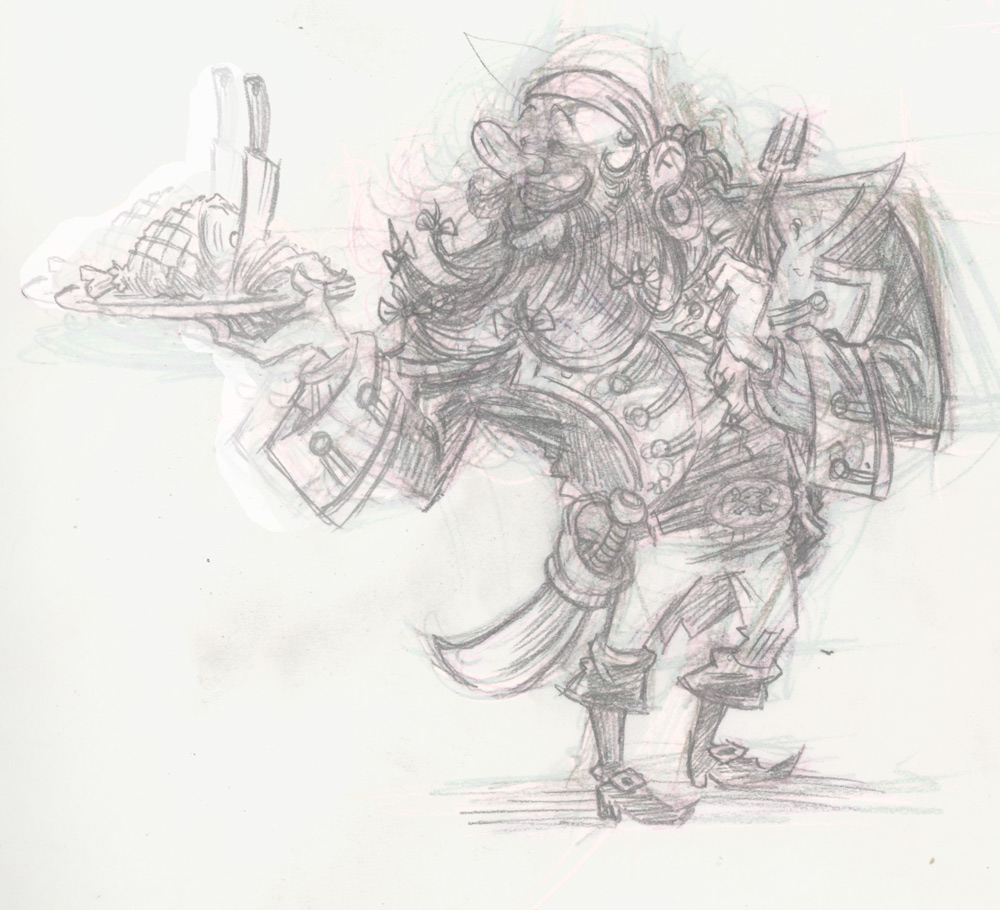 My other contenders for this week’s “P” drawing were pretty easy to eliminate since I’ve already drawn characters from both of the books they’re from: Pilon from Tortilla Flat and Portunus from Lud-in-the-Mist. That left just this fella: