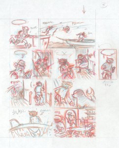 I’m working super-rough and I’m starting with non-photo blue and going over and over with progressively darker colors to gradually build up a composition I’m happy with. I “map” the dialog to each panel either with an arrow or just by numbering them.