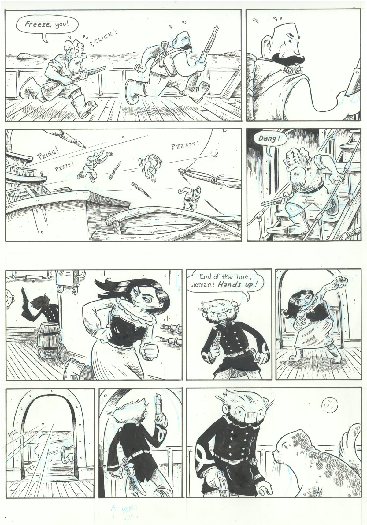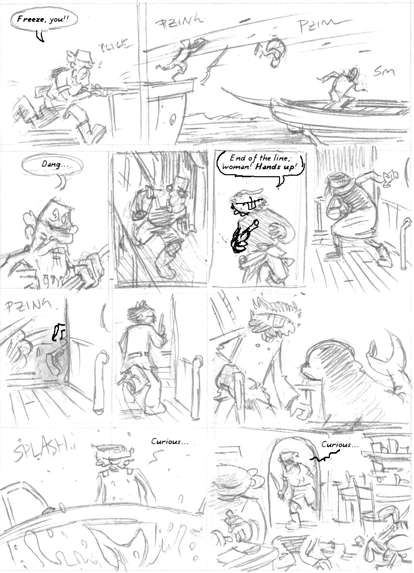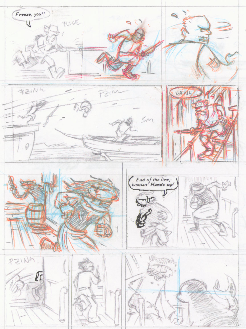 So, once I’d got the whole chapter through two rounds of thumbnails and into my binder, I sat down and gave it a good, critical read. One of the big problems I spotted was with this page in particular. First off, there’s just too much action going on in too small a place–both physical space and narrative space. Additionally the page has some really confusing back-and-forth between the two parallel stories going on here (Tevia pursuing the guy who jumps between ships, and Bulloch pursuing Isaebel).