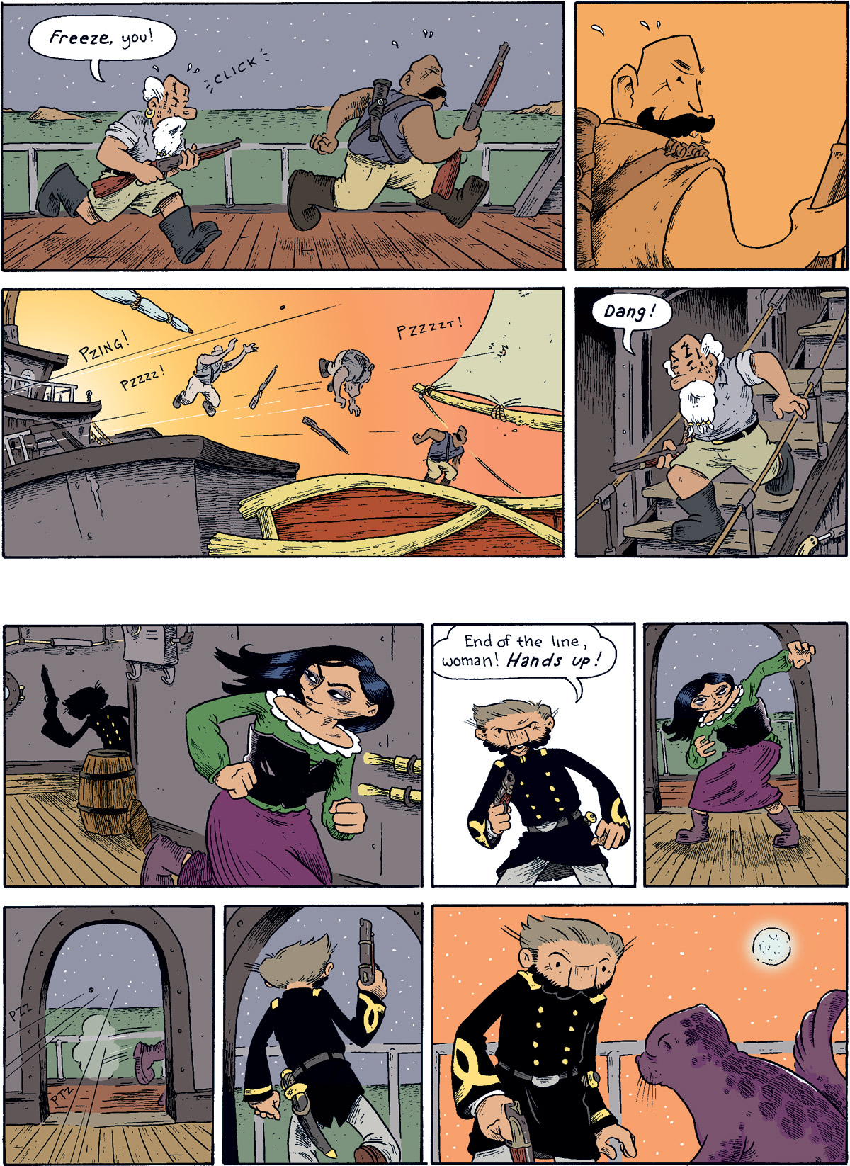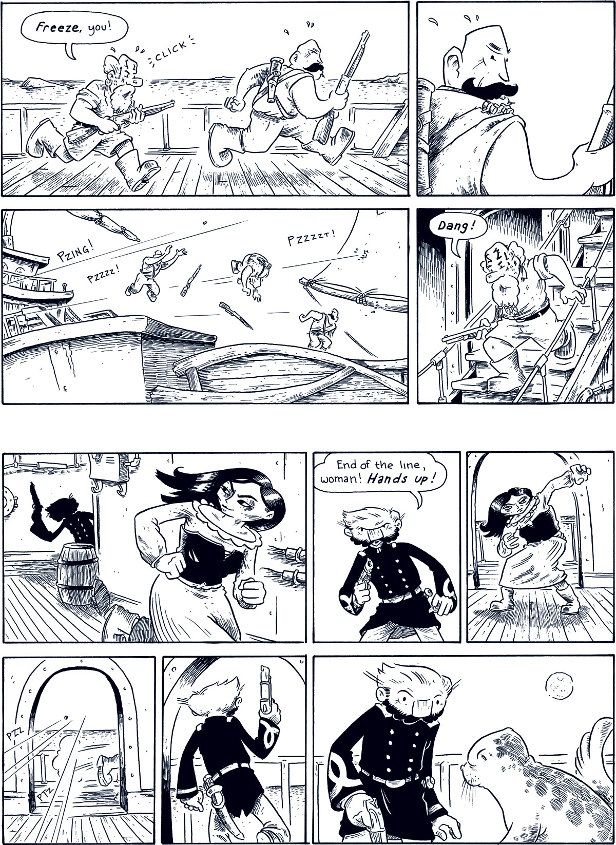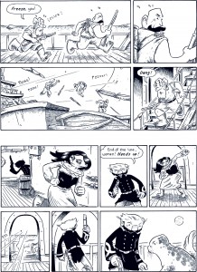 If you follow me on Twitter, you’re already in the know, but if not… Yesterday I wrapped up chapter three of my webcomic Oyster War. (New pages posted here. Begin the story here.) Chapter three starts here and runs thirteen pages, I think–the longest chapter in the book so far. It’s also nearly wordless and easily the longest extended action sequence I’ve ever done. (For better or for worse, neither Amelia Earhart nor Umberto Nobile engaged in a whole lot of ass-kickkery.) I have to admit, staging this extended fight/chase was a real challenge for me. I gained a whole new level of respect for people who work in comics genres that routinely have a lot of fisticuffs as part of the story. I’m looking forward to a bit of a break from this stuff in chapter four, which has a bit of plan-making on-board the Layla but focuses mainly on Fink, Isabael, and the other assorted bad guys.