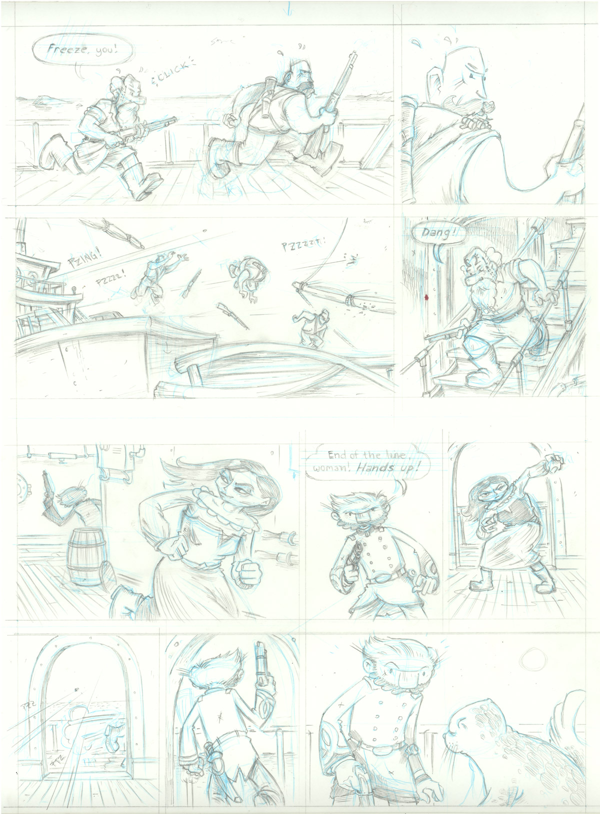 You can see that the final page follows the second-round thumbnails pretty closely. And it should–all of my storytelling decisions should have already been made by the time I sit down to actually draw the page. You can see that I rough in each panel in non-photo blue. I’ll take this out later in the process.