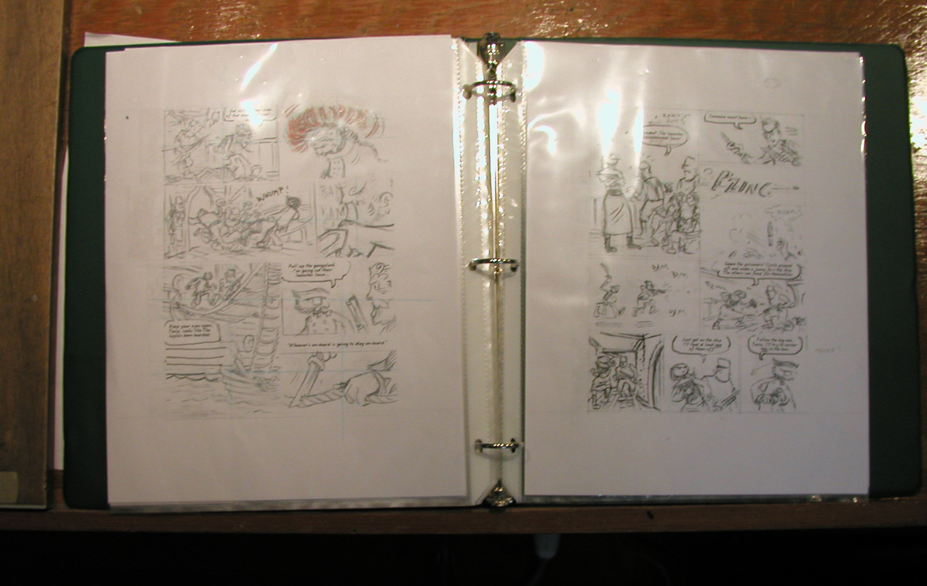 I can’t over-stress how important I feel it is to, at some point in the process before you actually commit things to bristol board, have some kind of rough version of your story assembled into a form that you can actually sit down and read through page by page–as your readers will eventually do themselves. This way you can experience both the page-to-page flow and the panel-to-panel flow. It also allows you to catch any potential problems you might have related to “flip”–things like trying to save important story “reveals” for left-facing pages that get shown only when the reader flips the page. You also get to experience the book visually as a series of spreads. And (this is important!) in a printed book the fundamental “comics unit” you need to be concerned with is not the page, but the spread.