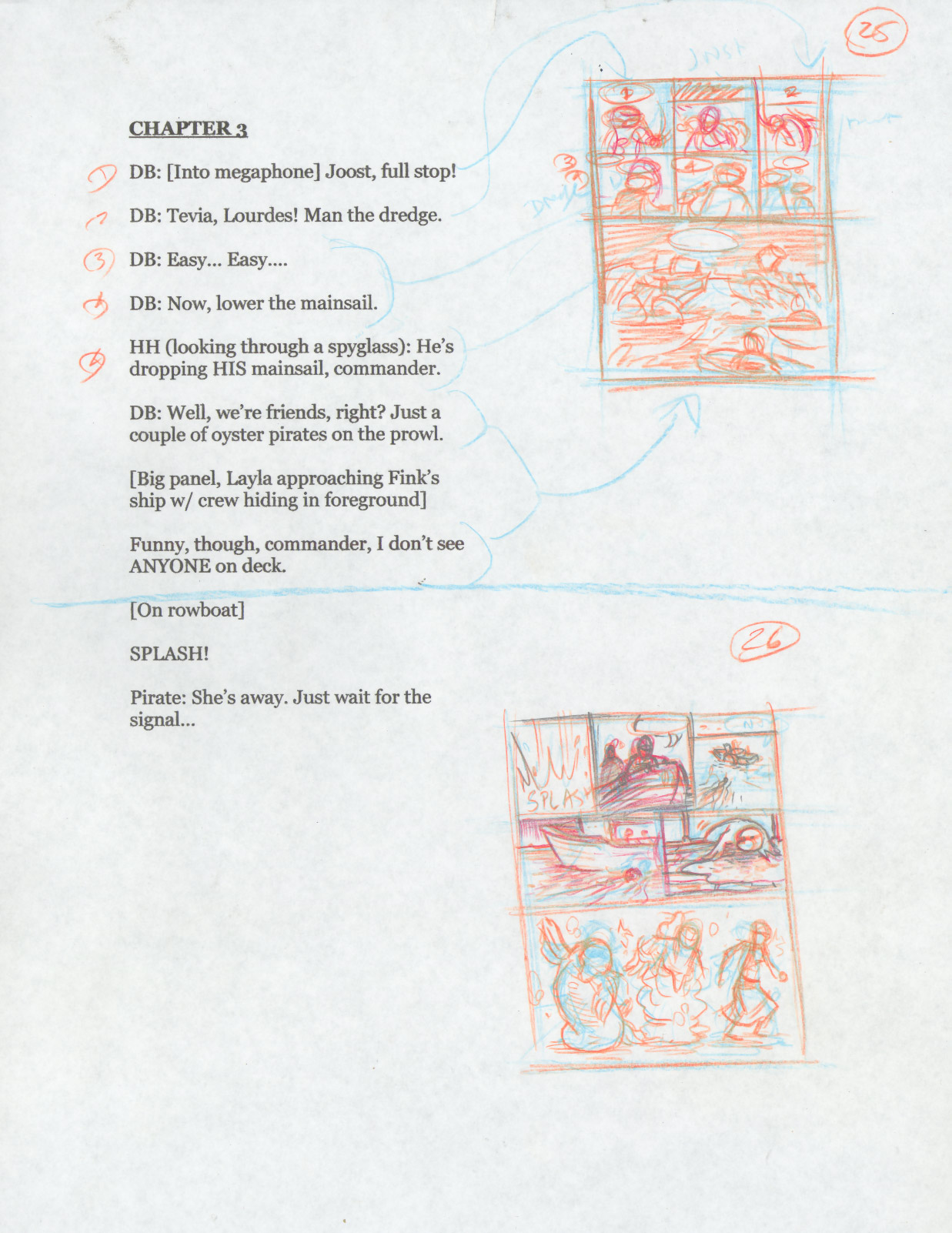I don’t want to get too much into my general writing process here, but if you’re interested I did a post about it a while back. I don’t always do this, but for Oyster War I actually wrote out a full prose summary of the plot before I began any drawing. Here’s the written summary of chapter 3: