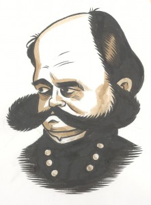 I recently incorporated some watercolor wash into a sketchbook exercise I do occasionally: ten-minute portraits. Facial likenesses is a real weak spot of mine, and this is one way I’m trying to address it. I give myself a nine-panel grid on a sketchbook page, and then using a timer try to do a likeness from a photograph in ten minutes. The basic breakdown is: pencil sketch – five minutes, inking – three minutes, watercolor wash – two minutes. Here’s a grid of them taken from a book about the U.S. Civil War (or, “The War of Northern Aggression” as we say in these parts.):