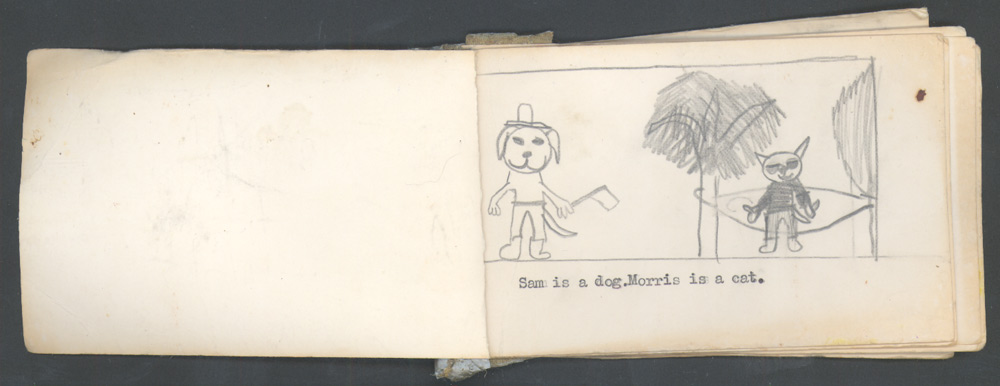 I guess construction paper pages with duct tape binding wouldn’t really make for a “buzz book” at MoCCA, but it’s not a bad effort for a kid in the early 70s. I had a “cat fixation” at one point, so I’m guessing the name “Morris” is a reference to Morris the Cat, the venerable cat food huckster of the 1970s.