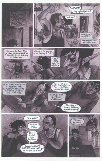 OK, so this really isn’t a minicomic at all; it is though, a self-published “floppy” that I got this summer and that I wanted to mention. Kindle is a fantasy book, but one whose tone is closer to something like Castle Waiting or even Lud-in-the-Mist than the books that probably come to mind when you think “fantasy.” The book’s main character, Taggart, is a half-goblin half-human who spends his time drinking and working on a novel in a local pub in the town of Seywerth. There’s also a parallel storyline beginning here that involves one of Seywerth’s clergymen. I really dig Bridgit’s lovely and strikingly atypical comics art–sample below: