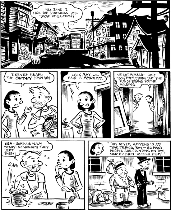 Here’s the first page of a 16 page book I’m putting together with Chris Reilly and Steve Ahlquist. The book’s called Goggles and Gloves and will be debuting at this year’s Small Press Expo–God willing and if the creek don’t rise, as they say.