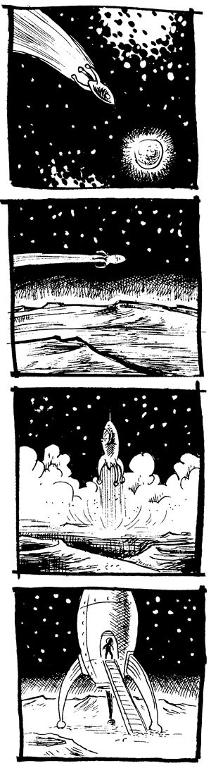 This assignment has been around since well before this book came out, and has been posted over at teachingcomics.org for a while. It’s from that site that I got the assignment when I tried it out in a classroom environment the last time I taught a comics class and, while the assignment looks fairly straight ahead, it’s actually pretty tricky. Part of the challenge is that it’s not worded very clearly: specifically, it’s not made clear whether the moon was the wrong destination… or whether he’s returned to the wrong “home planet” after visiting the moon.