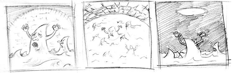 I think the assignment this week is to fully develop one of these into a pencilled panel and I’m thinking that I’ll settle on some combination of the first and second panel below. The first is pretty much what’s in the original thumbnailed page; the second is drawn as if we’re seeing it from above–which I like–but, I haven’t done a very good job rendering the perspective; and the third has a lot of graphic design appeal, but it’s pretty much the same panel arrangement as the first couple of panels from the second row of the same page.