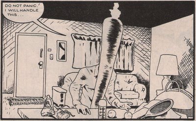 “Having read 5,000 comics in a single sitting to win a bet, this poor man suffered brain damage and appeared directly thereafter as – the Flaming Carrot!”