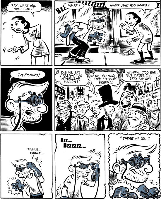 Here’s page three. When doing page two, I had forgotten that I wanted Raymond’s goggles, gloves and power pack to all be done with spot color (for reasons that will hopefully be obvious by the end of the story), but I caught it on this page. I’ll have to go back and add them to pg. 2.