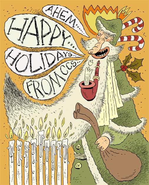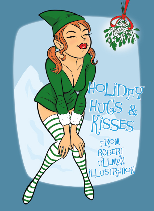 Here’re a few that arrived via email. Starting from the top, the first is from the Center for Cartoon Studies, drawn by Chris Wright; then, the unmistakable babe-atude of Rob Ullman, and finally J. Chris Campbell’s card/ornament: