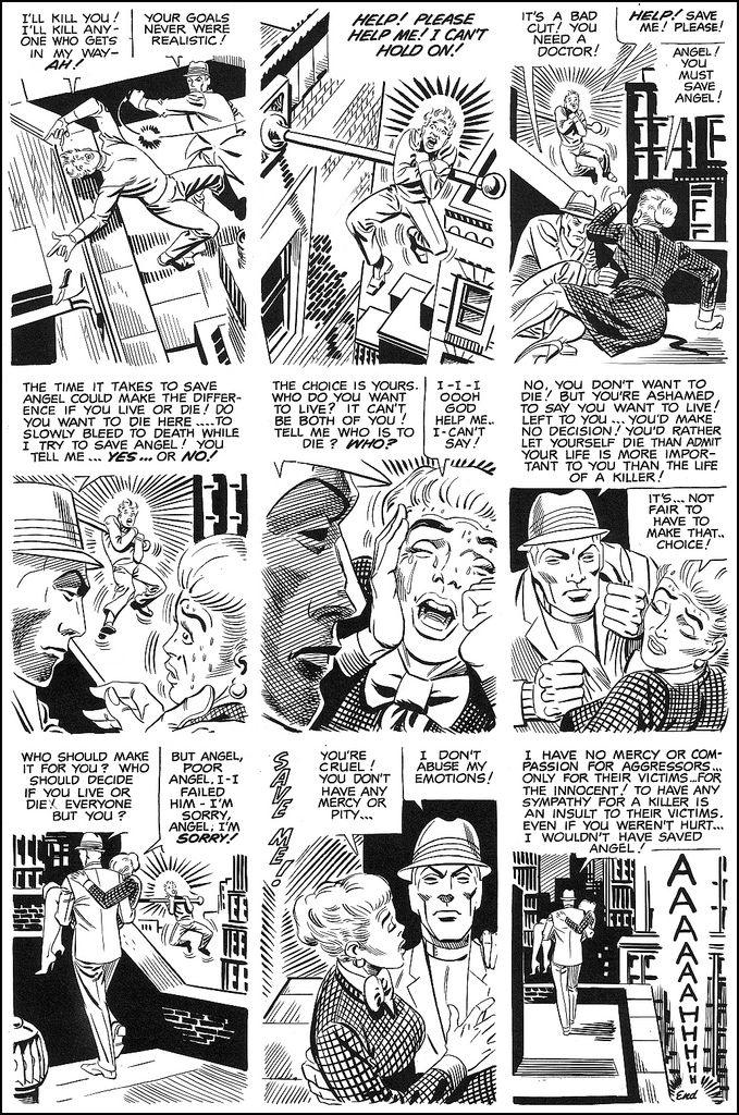 My favorite example of this, though, is the (in)famous scene from Witzend #3 in which Mr. A allows a criminal to fall to his doom. Note how in the first panel Mr. A is knocking “Angel” off the roof onto a flag pole below… yet, in all of the following panels, Ditko manages to place the pole in our view, often directly between the two protagonists. Literally, this is obviously not where the flag pole is spacially in the scene depicted, but in a daigramatic way that’s where the needs to be, with the criminal’s life visually hanging in the balance.