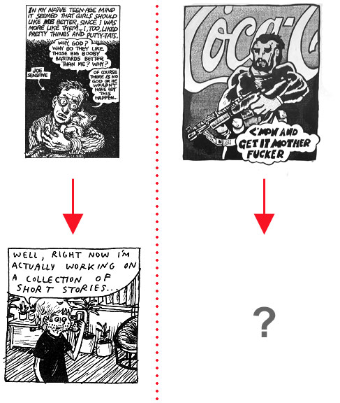 Todays non-superhero comics are (thankfully) bursting at the seams with stories of all stripes, but it arrived at this state via a path originiating with the underground cartoonists of the ’60s and then moving from there through an unfortunate developmental stage in the ’90s that was populated with more than its share of sissified self-confessional autobio comics.