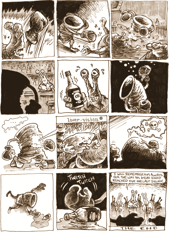 Here’s the tragic conclusion to the Boxing Bucket couch comic. The original final line, written by Chris Reilly, was “Though I will always admire the way he devoured those who opposed him, I will remember him for how his dead hand reached for one last drink,” but I had to just use the last section of it since I left so little room for text in the last panel.