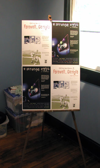 …And here’s a banner/plackard-thingie I made by attaching some color copies to foamcore with spray adhesive: