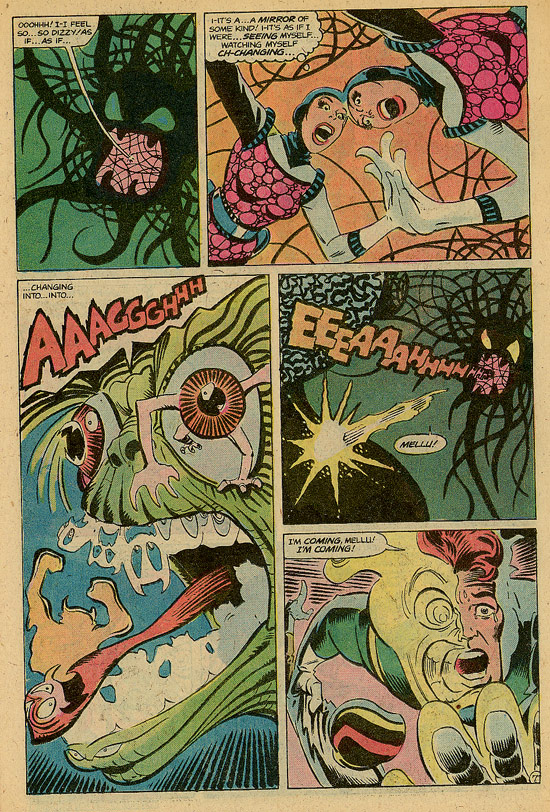 At some point, I want to do an in-depth post about the whole Shade the Changing Man series, which I think is Ditko’s last great work-for-hire work. Unfortunately, I neglected to spend any time at Heroes rummaging through the 50 cent bins looking for issues seven and eight which I still lack–so, alas my Shade post will have to wait. I did though look through the books I have before drawing this pinup and I was really struck by issue four in particular, which contains some of Ditko’s greatest bizarre, grotesque and abstract imagery. Some of this stuff makes his Dr. Strange work look tame by comparison. Here’s a page from issue four, for example: