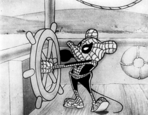 @Andy – The background is from “Steamboat Willie.” I just drew the Mickey/Spidey combo in the same pose and superimposed it on there, having first removed the original Mickey. With some monkeying around with Photoshop filters and whatnot I managed to get my drawing to blend in reasonably well with the background. If you do a google image search for “Steamboat Willie” you’ll turn up the still I used on the first page of results.