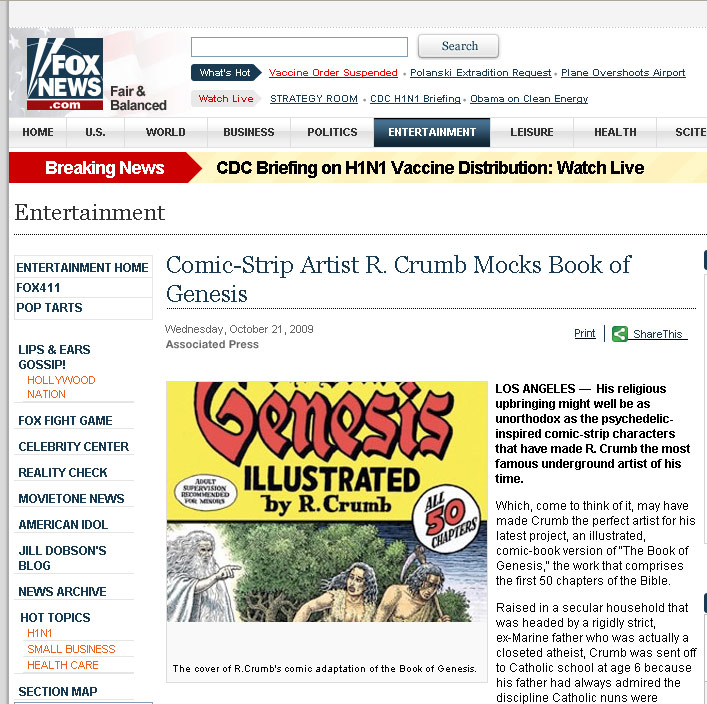 “R. Crumb MOCKS book of Genesis”?! I’m only about half-way through this book right now, but I’ve yet to encounter any “mocking.” Yeah, sure, there’s a lot of brutal fighting, sexual violence, etc. but such is the Old Testament. I think the only way you could read this word-for-word illustrated version of Genesis and think there was any “mocking” going on would be if you’d not actually ever read Genesis (which–given that it’s FOX News–may actually be the case here).