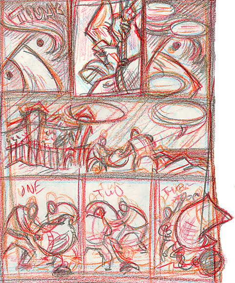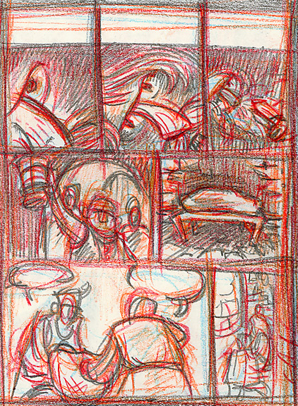 I’m using a standard 9-panel grid as a base. I tend to favor this, as well as a slightly more square than usual page shape, for most of my work. I’m just guessing at the sizes needed for caption boxes and voice balloons at this point.