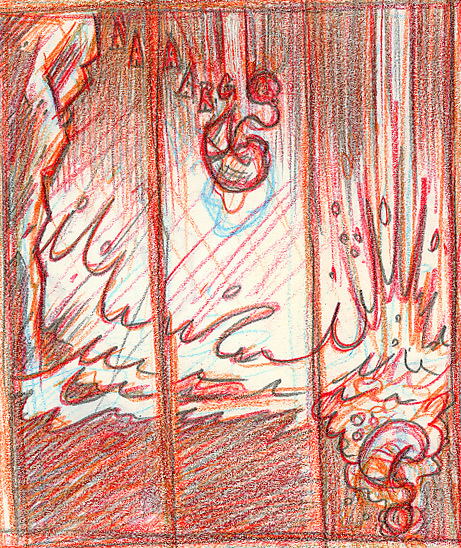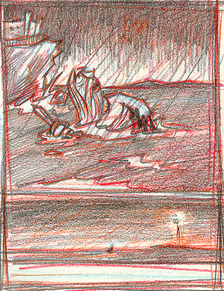 As you can see, I work in multiple colors–a trick I picked up when I very, very briefly worked in animation. I start in light blue, then move to orange, red and finally a regular B pencil. This allows me to go over and over an image, building it up and correcting as I go. I can go in with Photoshop and pull all the non-pencil color out as I move to the next phase.