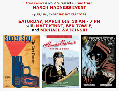 Yikes… It’s only January and my calendar is already filling up. (I’ve, in fact, added a calendar widget to the blog.) Right on the heels of my barnstorming Amelia weekend in February, I’ll be appearing at the second annual ACME Comics “March Madness” event March 6th in nearby Greensboro, NC. This’ll be my first in-store event at ACME and I’m really looking forward to it. Matt Kindt’s an all-around nice guy whom I’ve run into at various conventions and his Superspy is one of my favorite books of the last few years. I don’t know Michael Watkins’s work yet, but I’m looking forward to hanging out.