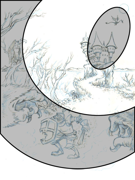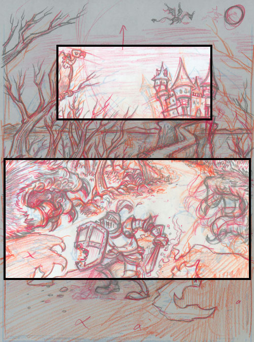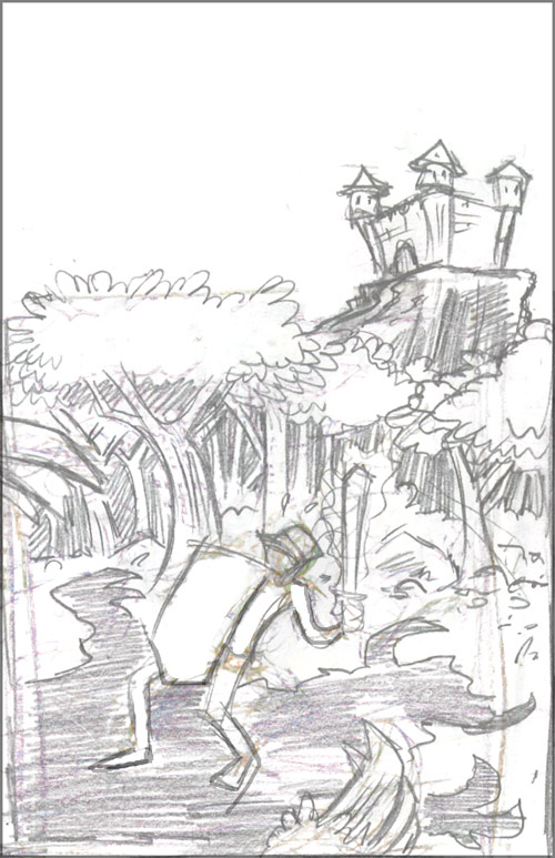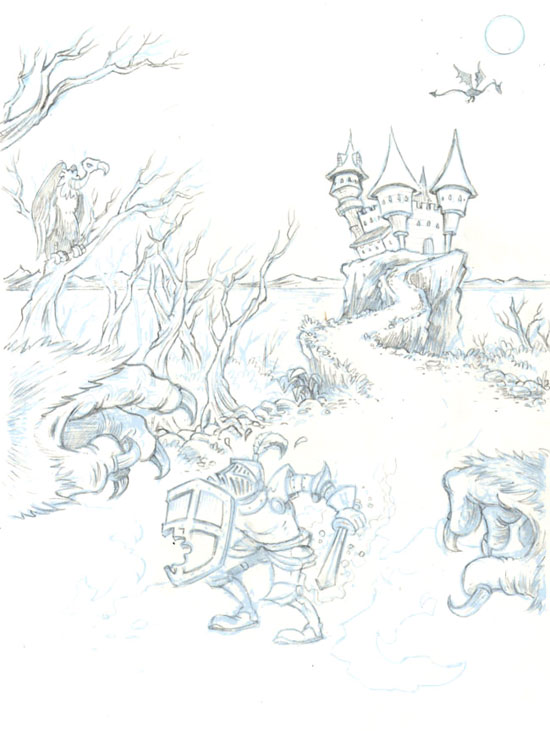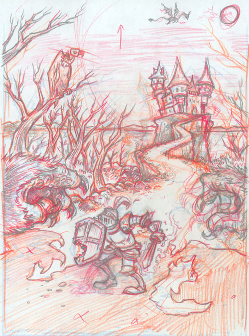 We’d decided to have the monster be out of the composition and maybe just suggested via shadows and/or a little bit of a claw, tail, or whatnot. I think Chris had in mind that the knight would be running toward the viewer with the monster behind. For whatever reason, I instinctively had him facing us with the viewer sort of “cast” as the monster. Here are my initial thumbnails: