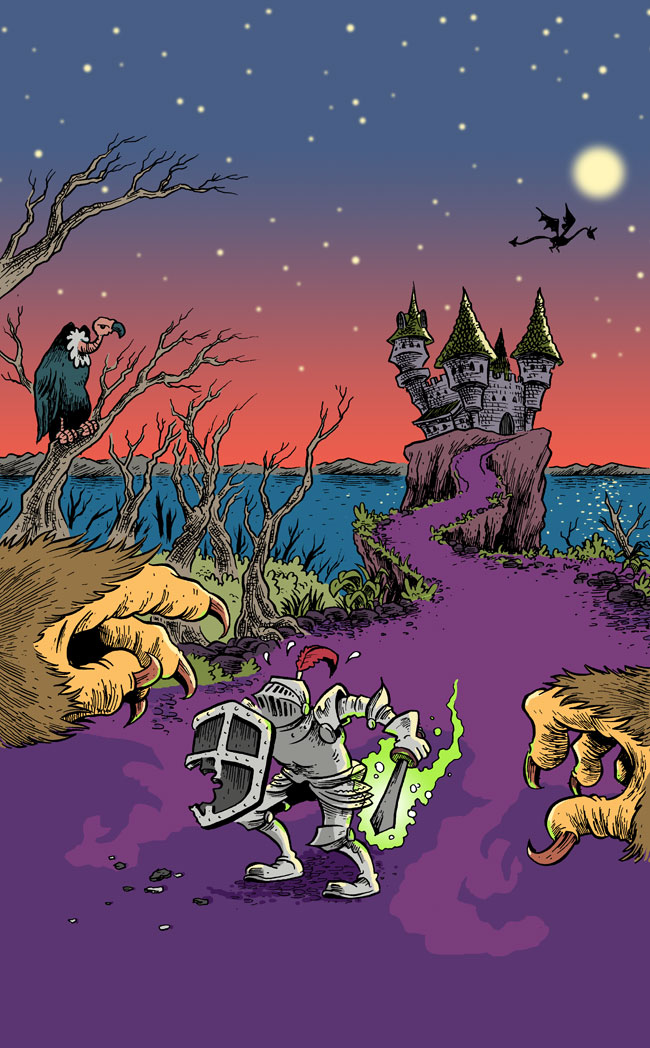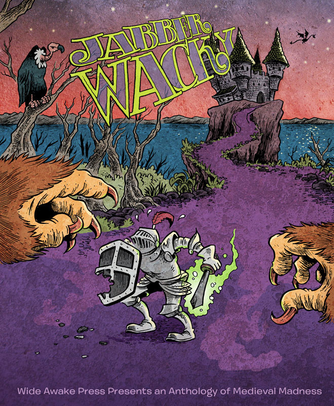 As they have for the last few years, the folks a Wide Awake Press are putting out a free dowloadable comic for Free Comic Book Day this year. For last year’s issue, Ancient, I was–alas–only able to do a spot illustration. This year, though, I was offered the cover, and of course snapped it up. This year’s theme is things medieval and magical, and the title is “Jabberwacky.” After a bit of back and forth with editor J. Chris Campbell, we decided on a basic Jabberwocky -derived image: a knight with a magical sword fending off some sort of giant beast. For anyone what’s interested, here’s how the process went start to finish: