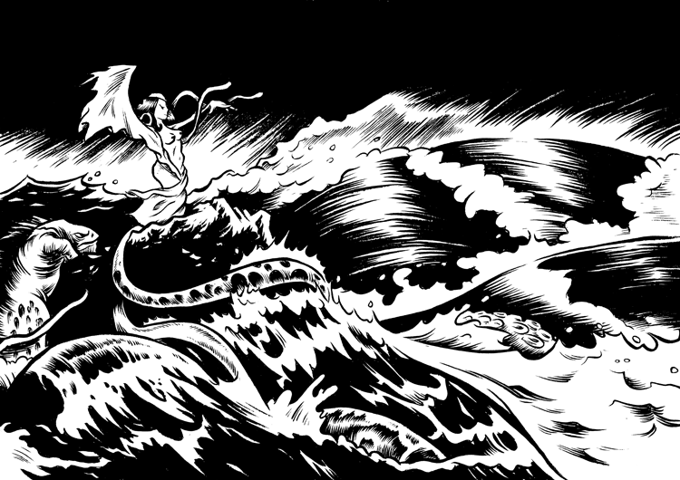 So, despite keeping pretty busy chasing my daughter around while she’s out of school for the summer, doing freelance work, and even a little work on Oyster War, I finally got back to this Sea Witch thing. Here’s the inked and cleaned up version. If my printer can handle it, I’m going to try to print this out on bristol board and maybe do some watercolor on it.