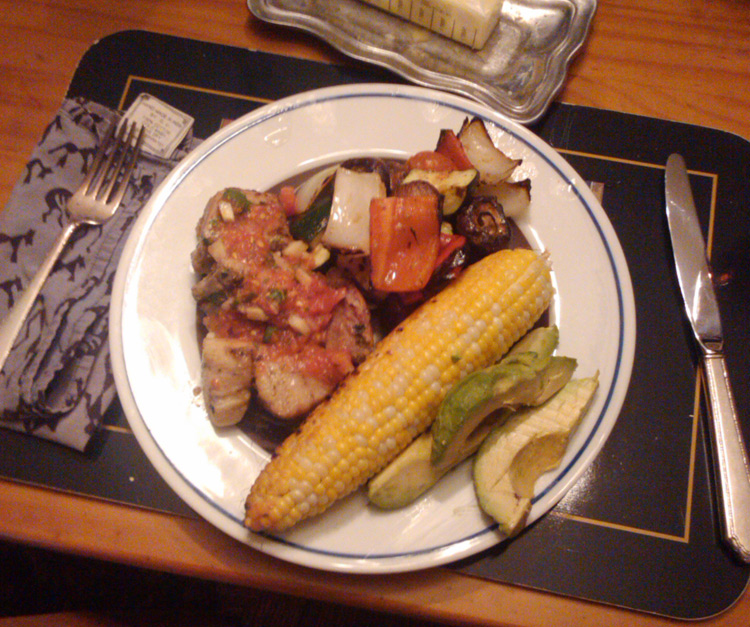 In the evening we finished off the day in typical American fashion for the fourth: grilling. Here’s an obscenely loaded dinner plate featuring lots o’ grilled stuff: grilled tuna steaks and sea scallops topped with salsa made from a friend’s garden tomatoes, grilled vegetables and corn, and a ripe avocado.