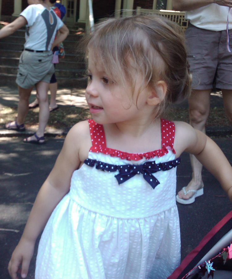 We spent the morning of this fourth of July at our neighborhood “parade,” which might be more accurately described as, “flag- and crepe paper-encrusted kids, dogs and bikes travelling around the block several times while someone plays Sousa marches on a boombox.” It’s great fun. We get the streets blocked off, do a pot luck/grill-out for the whole neighborhood, and arrange for the local firehouse to send an engine over (in exchange for a go at the potluck table, of course). Here’s my daughter in her patriotic regalia: