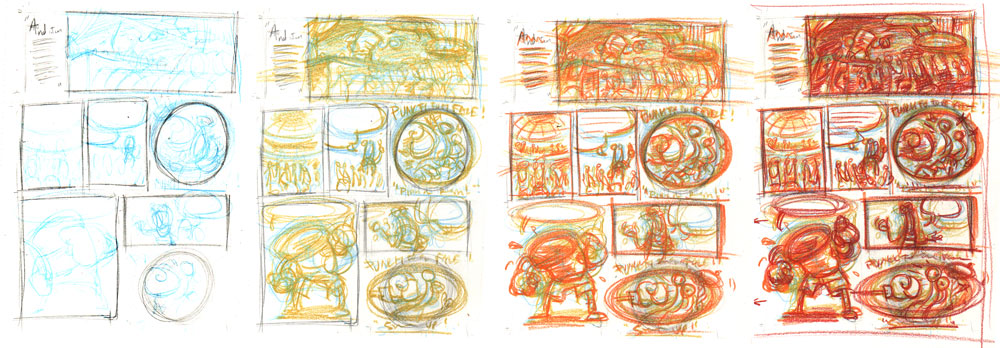 So, anyway…. In my posts about the fist page of the Boxing Bucket story, I talked a bit about “building up” the panels in a page by working in different colored pencils, but I thought it’d be interesting to post a page of thumbnails as it progresses through this process. So here’s the beginnings of page 2 of the Boxing Bucket story, starting with non-photo blue, then to mustard, then to orange, then red.