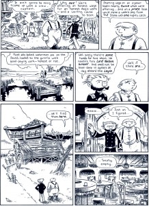 Well, here’s a first–and only marginally successful–attempt to use my webcam for something other than Skyping with relatives. I clipped the thing to my above-drafting table track lights and tried to do a time lapse video of my inking a page from Oyster War. The camera’s too far away by a factor of about two and the glare from the lights is pretty bad, but I suppose it’s worth looking at.