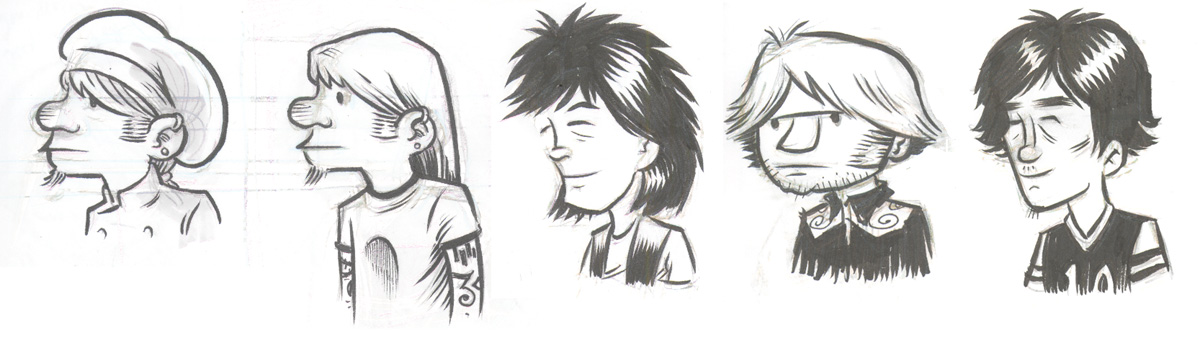 Now, if you know anything about me personally, you know that I worked in kitchens throughout the 90s and was in fact a touring musician on the weekends. This is not a coincidence. Rest assured, those of you who knew me then, this is a work of fiction. I can’t help, though, but to draw on some of my own experiences from that period as I start putting this together. I am, though, designing the characters in the band as deliberate visual homages to the guys that I played music with back in those halcyon days. I imagine that by the time ink hits paper to do some test pages they’ll look a lot less similar to anyone “real life,” but I’m using them as a starting point. In the preliminary character designs above you can see the main character (nameless at the moment, designated in my notes only as “H.P.” for “hero/protagonist”) on the left in chef gear and then in his street clothes, and his bandmates to the right. I can see now that I’ve got them all together that I really need to rework the two guys with dark hair so that they’re not so similar in basic shape.