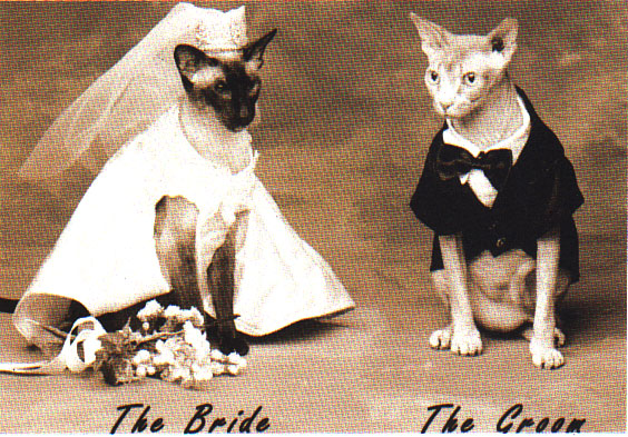 This is the image that was on the exterior of a “Thank You” card I received from my newly-married friends from Charlotte, John and Daphne. They have apparently dressed their cats Epiphany and Sue (who’s actually a male cat, and a hairless one at that–just like Mr. Bigglesworth) as a bride and groom.