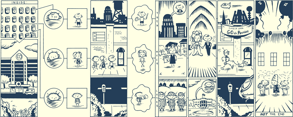 Here’s a cartoon I originally did for a charity auction for the Winston-Salem Arts-Based Elementary School. The first version of this was executed live in an hour (although I “cheated” a bit and did a lot of the pencilling beforehand) then immediately auctioned off. This version is a commissioned re-creation of that. It chronicles the lives of three people who attend the school using a sort of Chris Ware-style diagram/comic…except instead of being depressing and maudlin it’s goofy and cutesy. (Now, where’s my copy of Kochalka’s Cute Manifesto?)