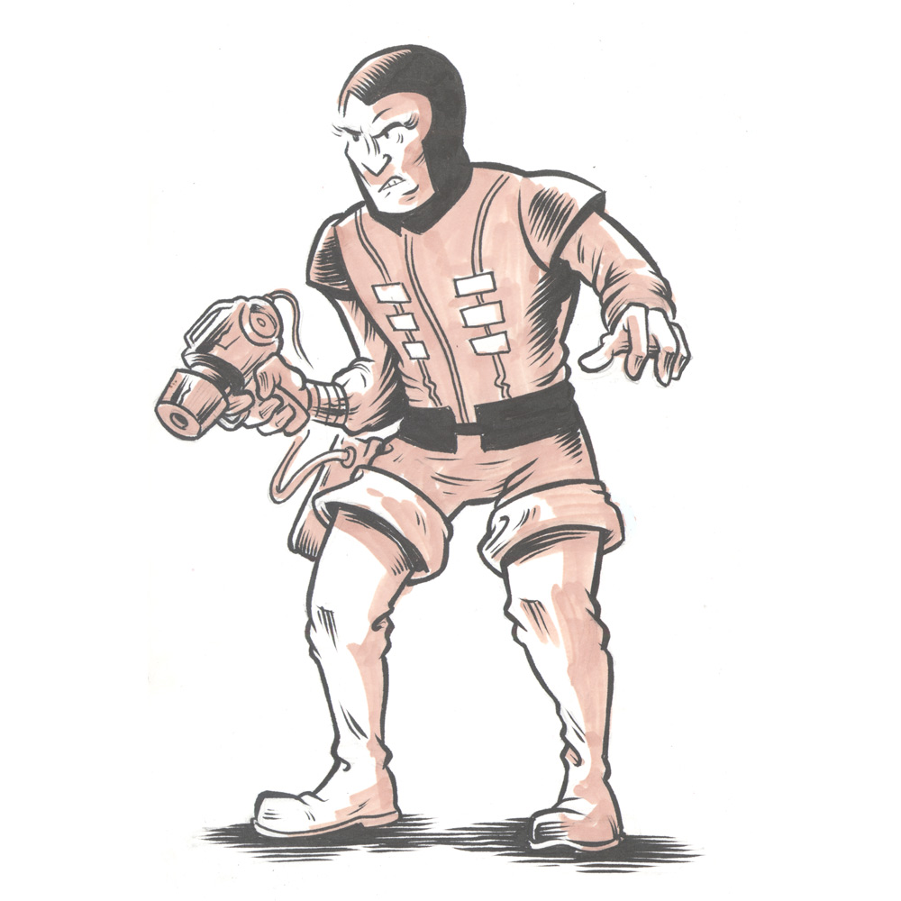 Here’s another one of my superhero mini-pinups: Trapster. Unlike some of the other b-list characters I often find myself drawing, I actually have a real fondness for Trapster. Like a lot of comics-reading folk my I age, I grew up reading the John Byrne Fantastic Four and I recall really liking the issue where the Trapster tries to infiltrate the Baxter Building but is eventually (and embarrassingly) defeated by the FF’s robot, H.E.R.B.I.E. (Issue #265, I think). From my digging around on the internet, it looks like his costume has been changed significantly since then, but I’m still partial to the one here from The Official Handbook of the Marvel Universe.