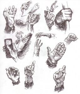 For my hand-drawing exercises, I use magazines–specifically, I use TIME magazine (which I subscribe to anyway). If you’re going to do this, it’s preferable to use news magazines rather than, for example, fashion magazines. News magazines will contain candid shots of real people’s hands in natural poses; fashion magazines feature posed hands that are often quite unnatural. What I do is basically start at the beginning of the magazine and draw every hand I see that’s printed big enough for me to see and draw reasonably well. Then I just keep going until I’ve filled up a sketchbook page. That usually takes me around 45 minutes. Here are my three most recent hand exercise pages from my sketchbook: