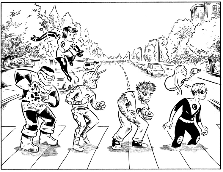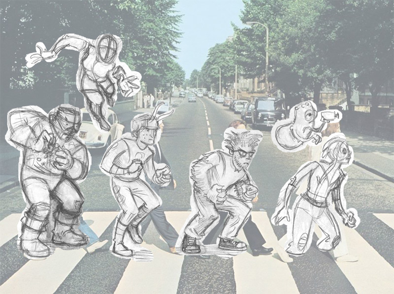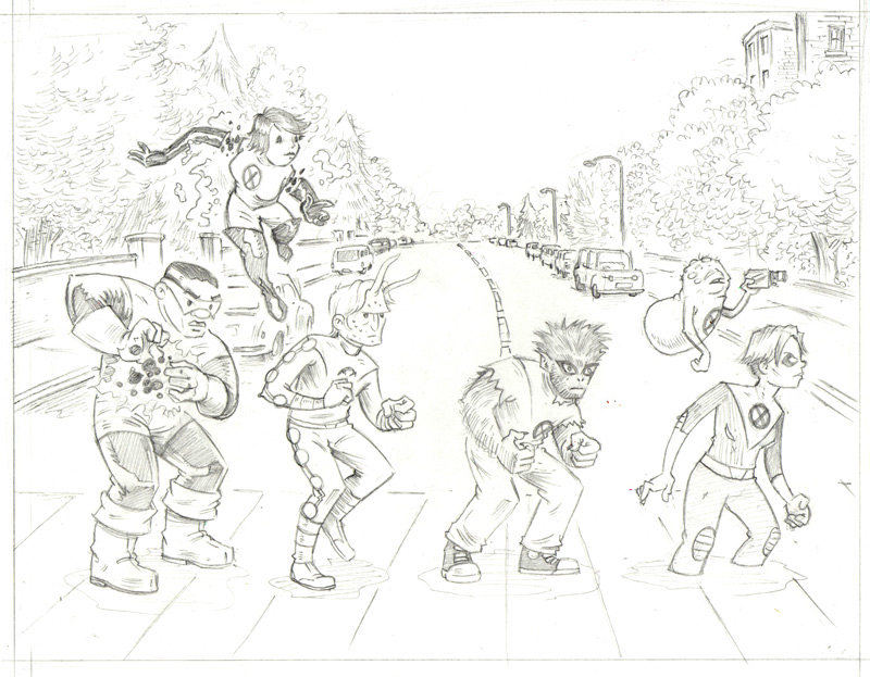 Initially, I’d started out thinking I’d just do a straight “pin-up” of the team–just them lined up, standing on a blank background. Searching for ideas, though, I remembered how much I loved Mike Allred’s rock and roll comic book series Red Rocket 7 and I started brainstorming on rock-themed ideas. What I decided to do was to base the drawing on a well-known rock album cover. I needed something that was immediately recognizable and that also featured actual people on the image (rather than a design or illustration) so I could “swap” those people out for the members of X-Statix. I narrowed it down to the cover of the Ramones first record and The Beatles’s Abbey Road. The client liked the idea and selected Abbey Road, so that was settled and I got working.