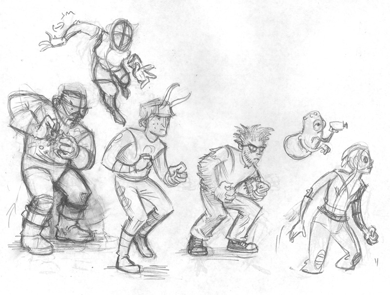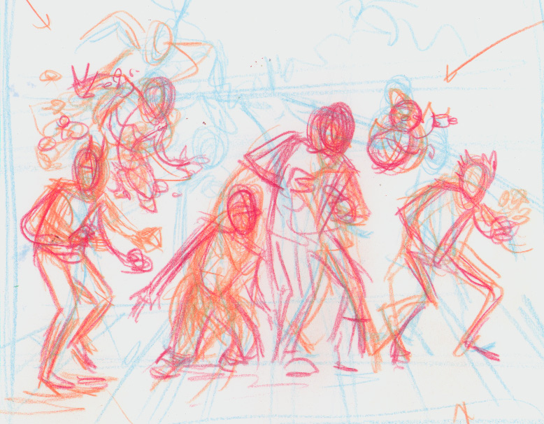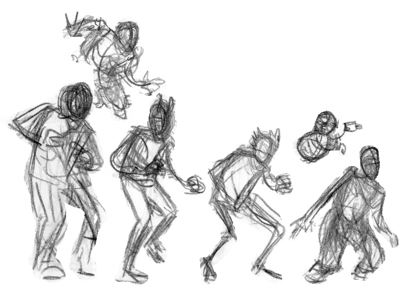 I began in my sketchbook, just doodling out poses in pencil. I start with a light blue, then orange, then red, then (if necessary) going on to pencil for a final refinement. Here, though, I just wanted to get something on the page to start monkeying with, so I just went through three iterations: up to red.