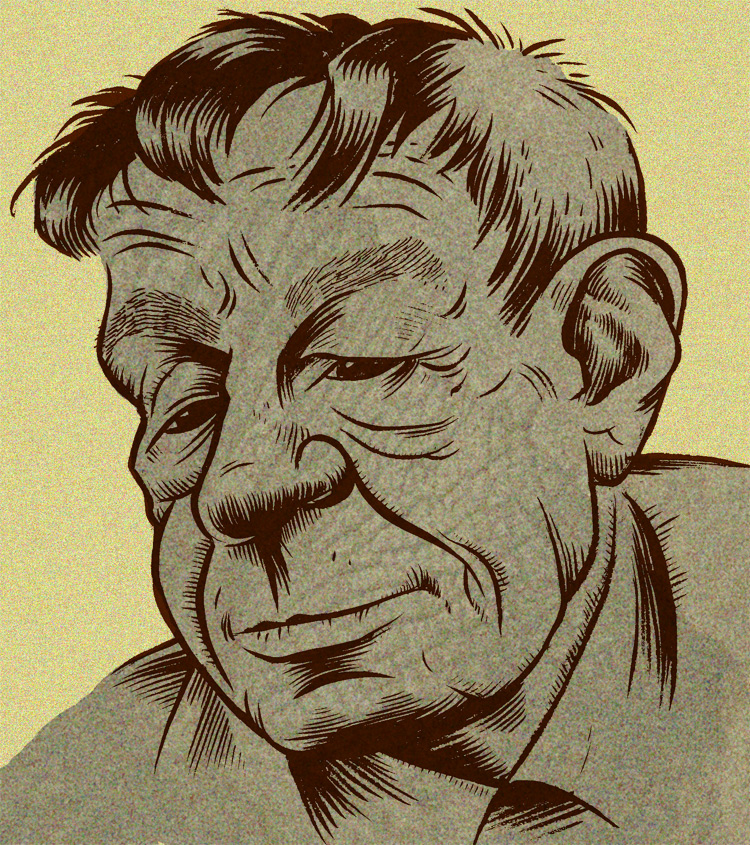 Tonight’s portrait night subject is writer W.H. Auden, as suggested by Eric Newsom via Twitter. This isn’t a bad likeness, but it’s definitely a lot more literal/less cartoony than I’d like. I need to try next week to really, really push things toward a more abstract and less detailed rendering. I should really subject myself to the proverbial “taste of my own medicine” and do this great Ted Stern caricature exercise that I’ve occasionally made my students do.