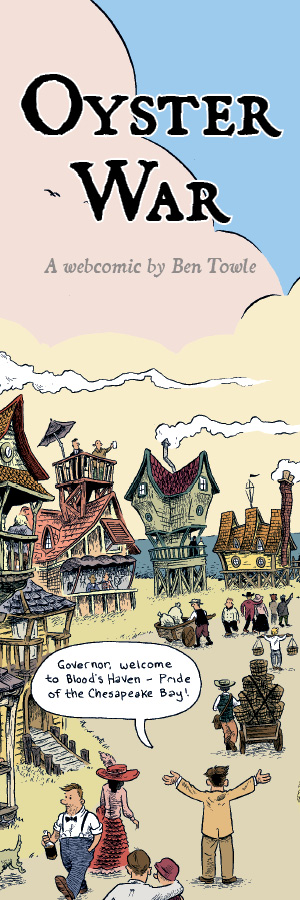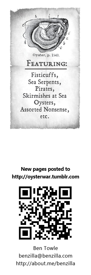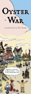 I’ve been making strides recently to be a better self-promoter. I’m still not on Facebook, but hey, I’ve been on Twitter for a while… and now I’ve got bookmarks! OK, bookmarks are as old-timey a promotional item as possible and not “social” in any way, shape, or form… but I’ve had good luck in the past using them as promo items (I did a pre-release Midnight Sun bookmark with the Diamond order code in it) and so I’ve done another batch in advance of convention season to promote my ongoing webcomic, Oyster War.