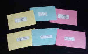 So, here’re some cards. For each row of the grid, I have a set of three cards where the first slip is on yellow, the second slip is on blue, and the third slip is on red. As you’ve probably deduced, each row of the grid represents a “story arc” for a simple story. The first slip is an “initial state” and the latter two cards are each a “change of state.”