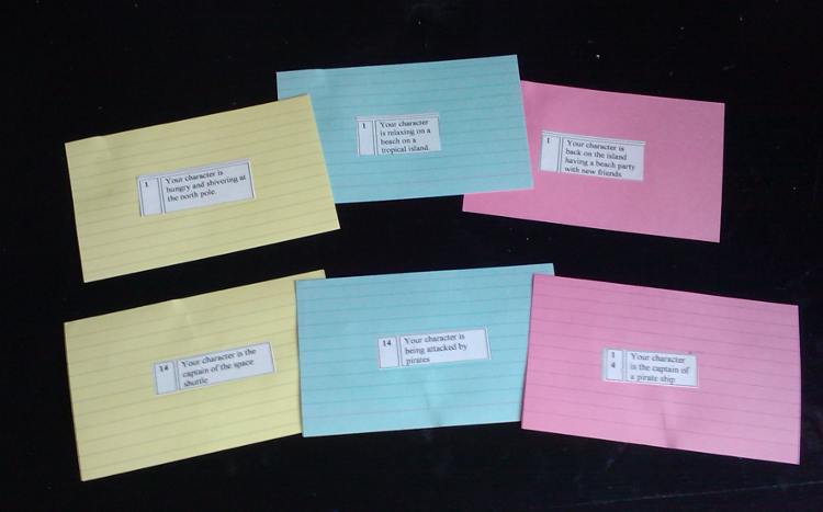 Here’re a couple of methods I’ve come up with for super-quick character generation. For both of these I use a stopwatch to limit the time each student can work on a character.