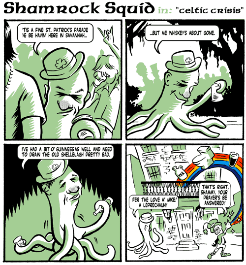 Here’s an invite I did for a party in Savannah a couple of years ago. It features “Shamrock Squid,” a (supposedly) public domain alt-comics character. The balcony on the house in the last panel is attached to the apartment we lived in.