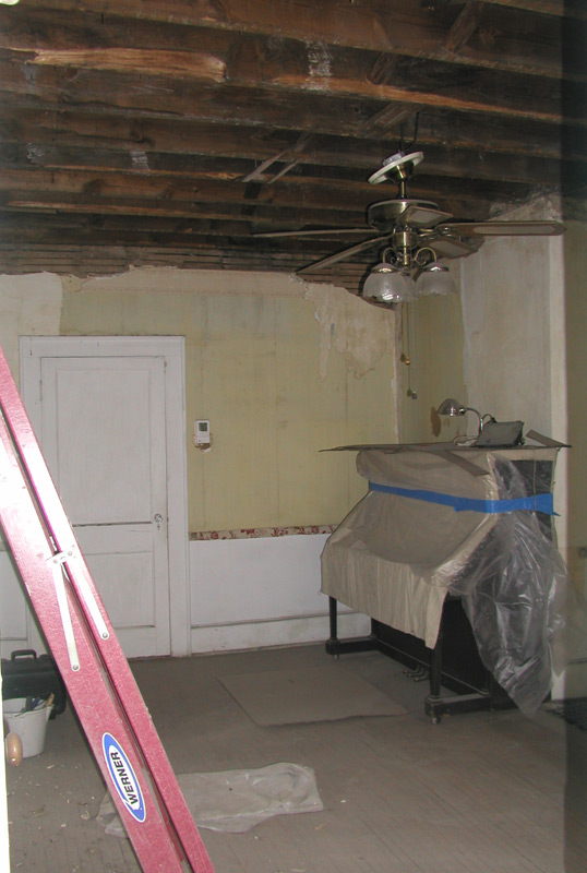 Here’s the living room, now with the bulk of the ceiling torn out, damaged plaster removed (but with wood lathe still in tact), and the foyer partially gone.